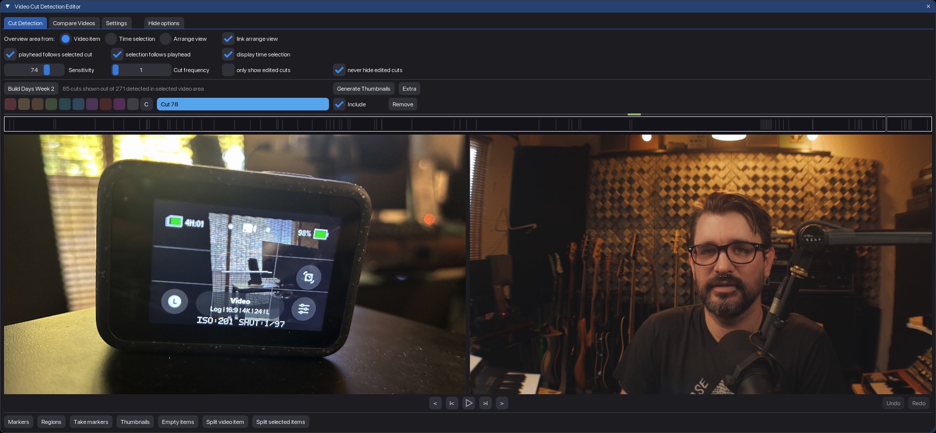 This script can automatically detect the camera cuts in a video file, showing you the frame before and after, and after naming and coloring you can batch import to REAPER as markers, regions, or take markers. You can also generate thumbnail images for REAPER’s timeline at the cut points.